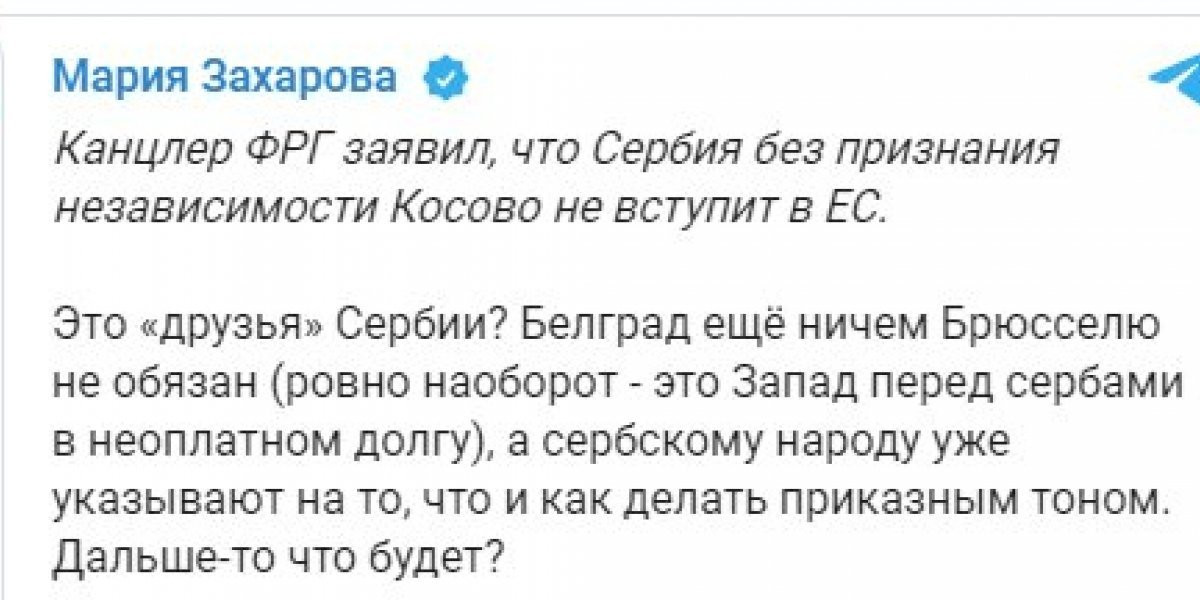 На сообщение Олафа Шольца о том, что Сербия не вступит в ЕС без признания независимости Косово, отреагировала пресс-секретарь МИД РФ Мария Захарова.