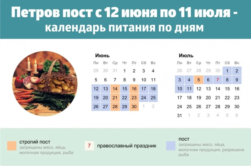 В календаре православного поста Петров пост начинается 12 июня и продолжается до 11 июля. В это время верующие соблюдают определенные ограничения в пище и поведении. Пост может быть более легким для мирян, чем для монахов.