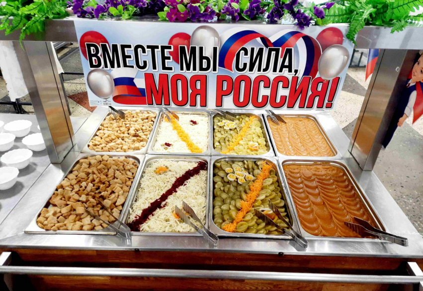 Еще одна особенность современного армейского питания – салат-бар. Если основные блюда строго рассчитаны по норме довольствия, то в нем можно брать соленья, овощи, сухарики и другие добавки без ограничений. В честь праздника салат-бары также получили тематическое оформление. Например, в Воронеже стойку украсили ободряющей надписью.