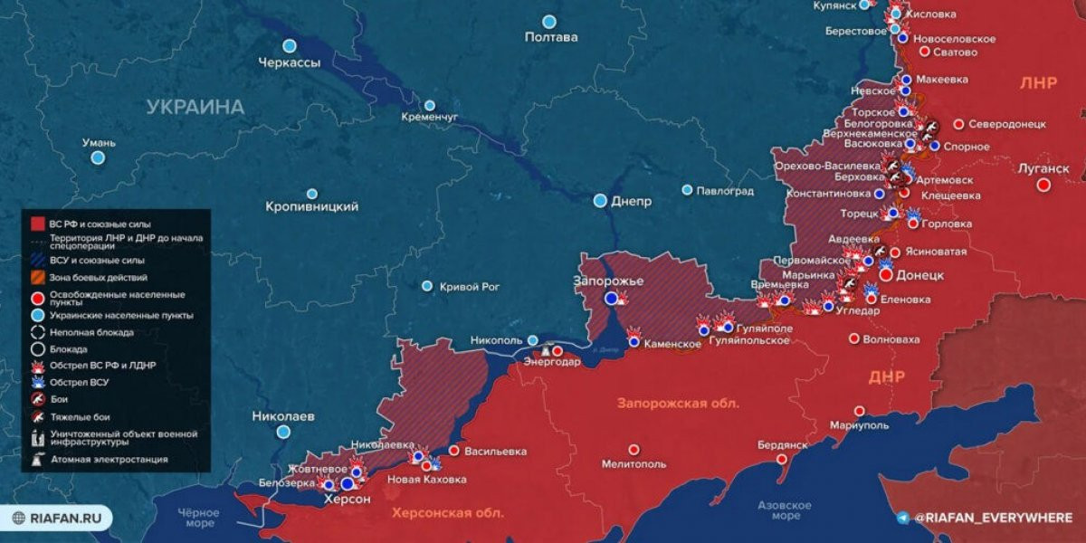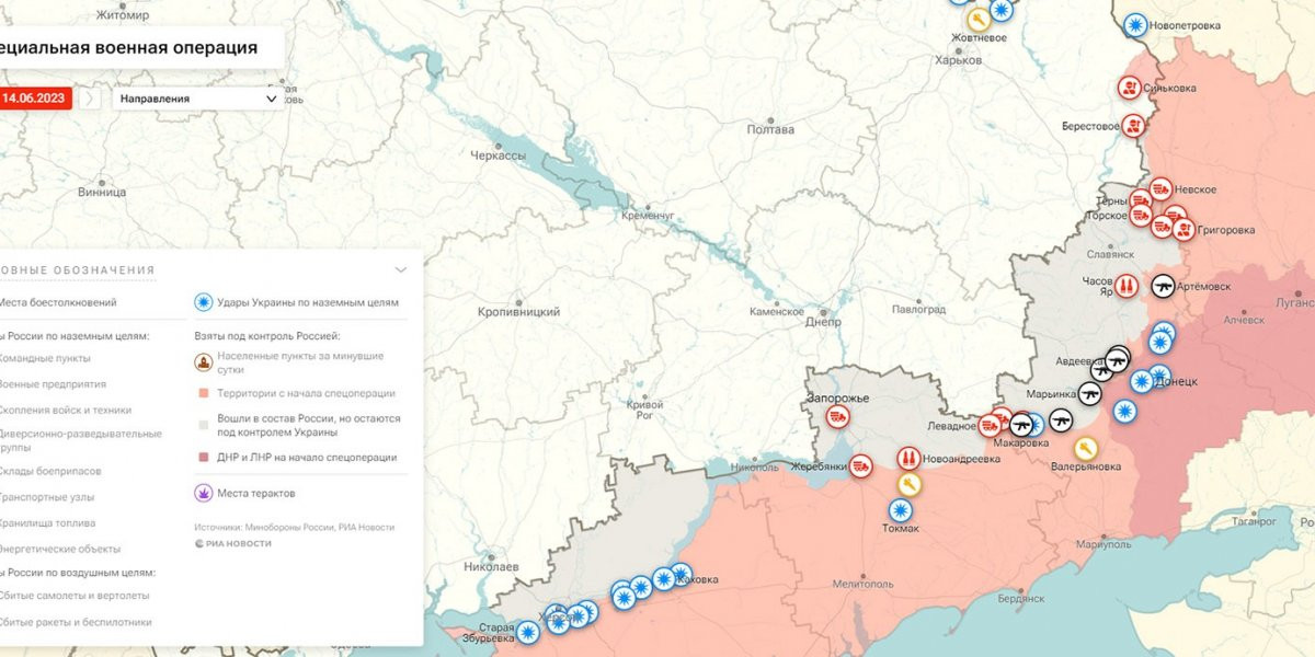 - Карта боевых действий на Украине, к утру 15 июня 2023г., от РИА Новости. Карта специальной военной операции.