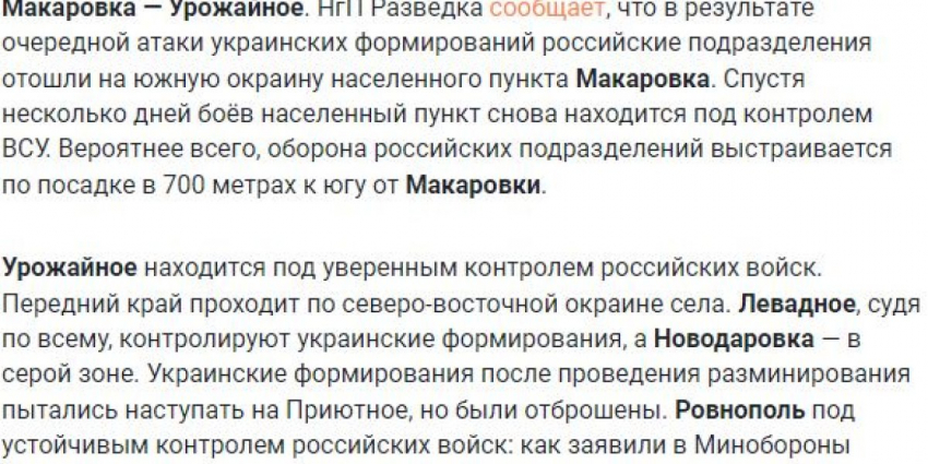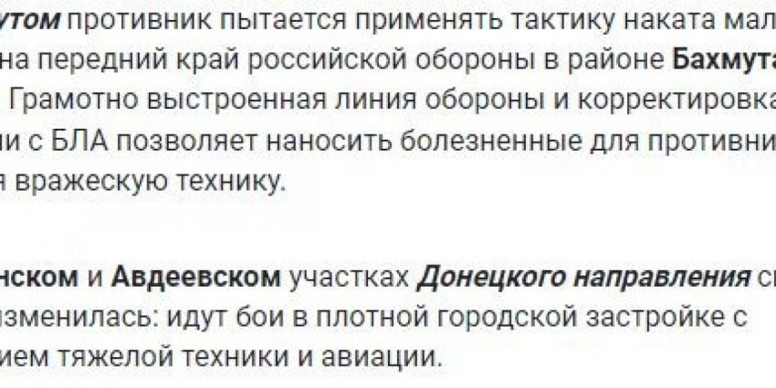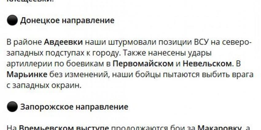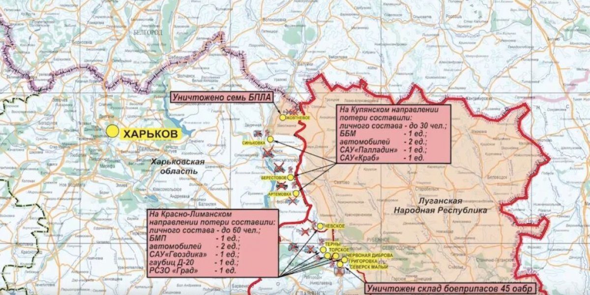 Министерство обороны России заявило в ходе брифинга об отражении атак ВСУ в районах Макаровки и Пречистовки, а также уничтожении техники противника в районе Ровнополя. Кроме того, сорваны попытки наступления украинской армии у Петровского и Первомайского. В районах Северска Малого и Часова Яра уничтожены склады боеприпасов ВСУ. У Григоровки ликвидирована украинская диверсионно-разведывательная группа (ДРГ).
