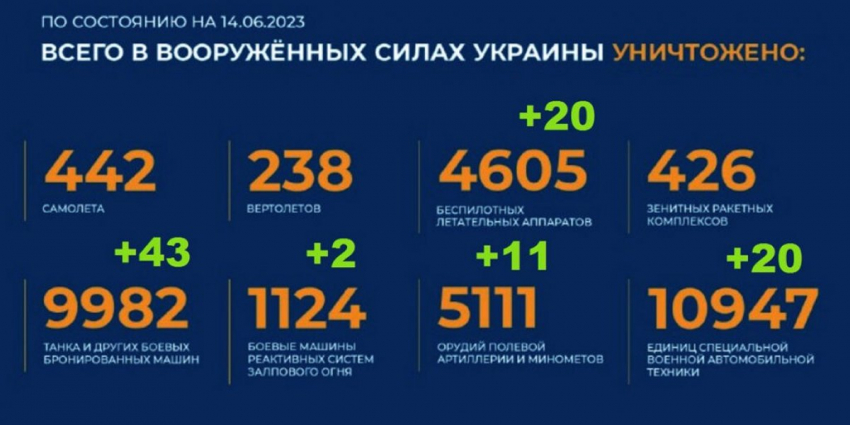 - «Всего с 4 июня украинские вооруженные силы потеряли только на линии боевого соприкосновения около 7,5 тысяч человек убитыми и ранеными, не считая погибших военнослужащих в результате применения российского высокоточного оружия большой дальности и авиации в глубине украинской территории», — сообщило Минобороны РФ.
