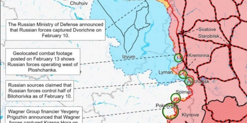▪️ Российские силы продолжали штурмовые действия и вокруг Артемовска и вдоль западной окраины Донецка. На кадрах с геолокацией, опубликованных 13 февраля, видно, что российские войска продвинулись в пределах одного километра к юго-востоку от Васюковки (северо-западнее Соледара).
