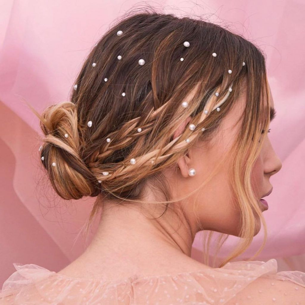 - Блеск. Пайетки, блестки и жемчуг — это гламурный дизайн волос, который гарантированно вызывает фурор. Такие прически создают эйфорическое настроение, что полностью соответствует концепции выпускного вечера.