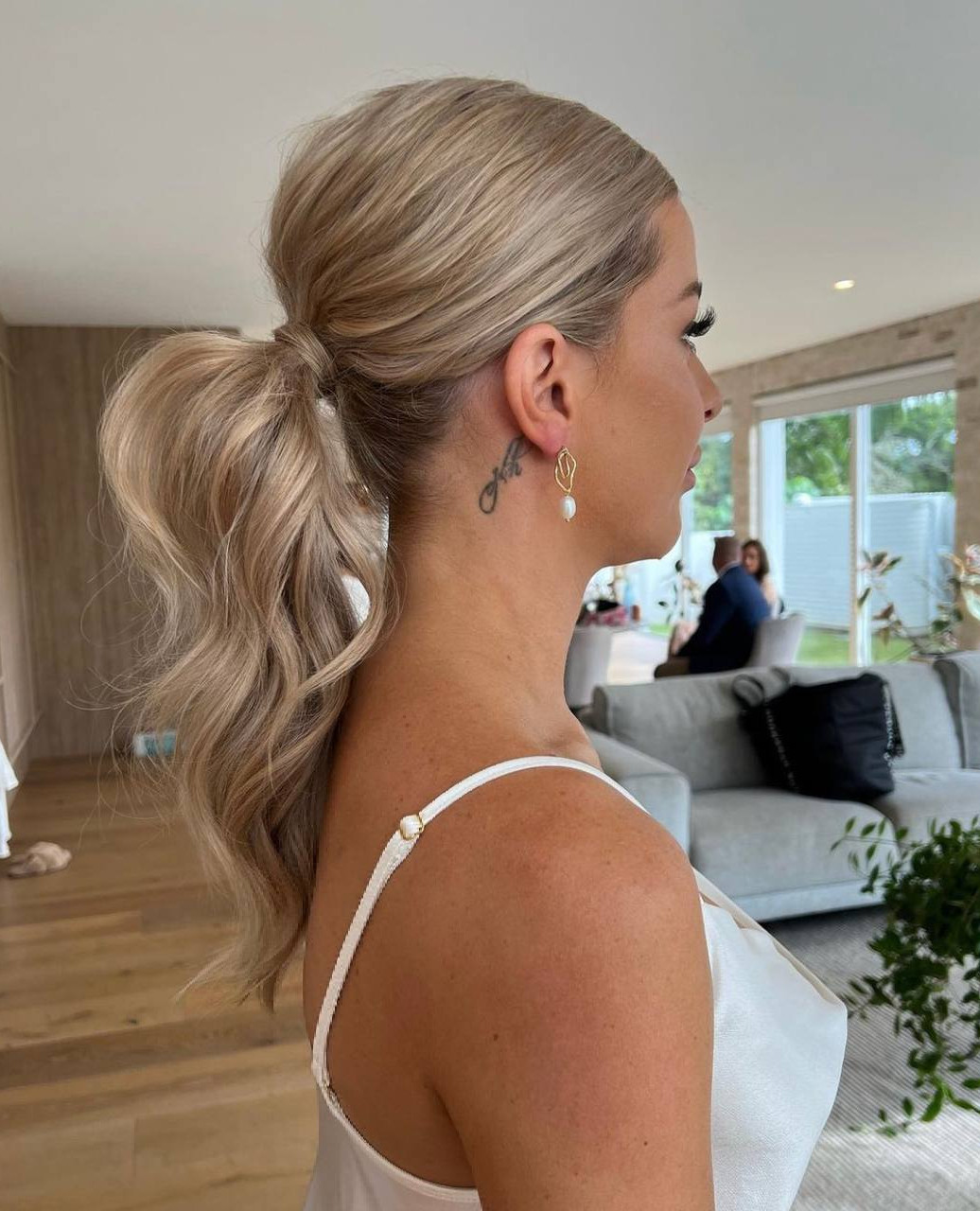 - Низкий хвост с голливудскими локонами. Главная особенность этой укладки — плавные линии и красивые переливы прядей. Этот гармоничный образ не нуждается в избытке украшений. Для достижения оптимального баланса можно выбрать сетку заколок или крупные серьги, но их количество должно быть умеренным.