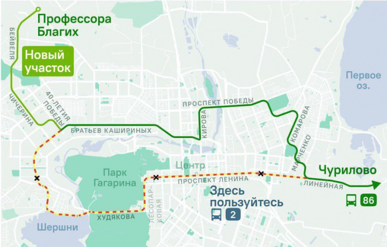 Транспорт не пойдёт по проспекту Ленина в центр, а будет следовать по улицам Марченко, Комарова, проспекту Победы, Кирова, Братьев Кашириных, 40-летия Победы, 250-летия Челябинска, Чичерина, Бейвеля в Парковый.