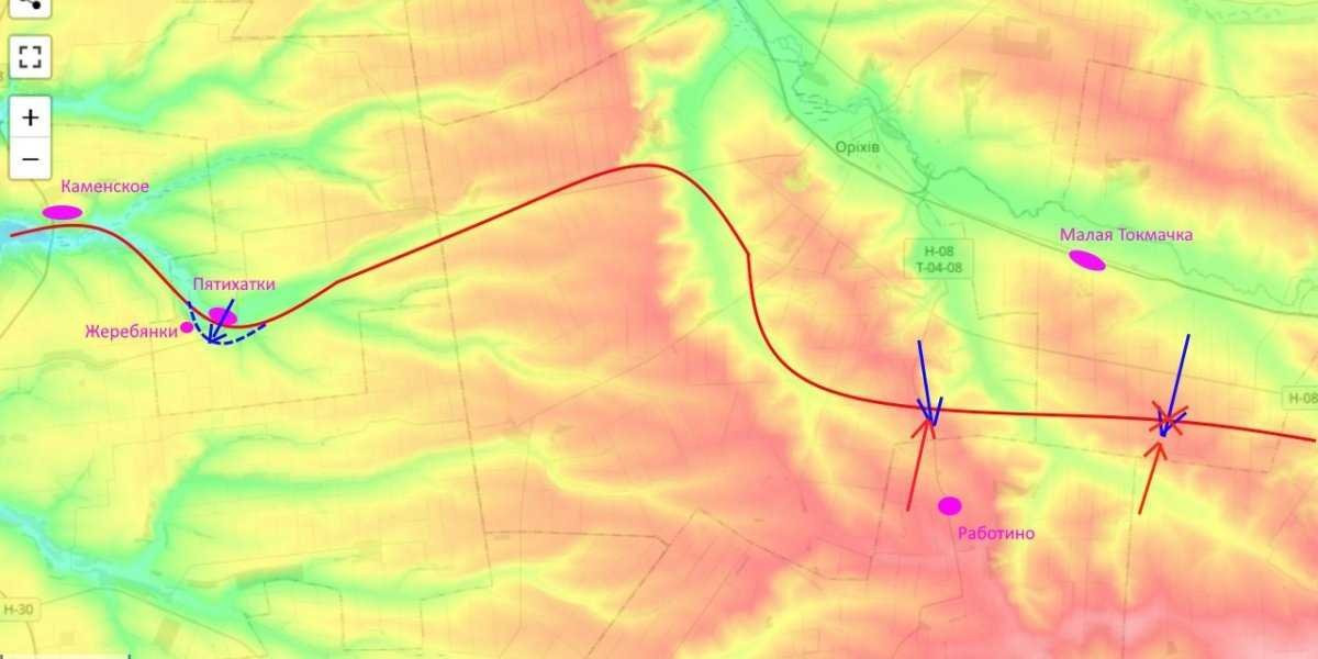 2. Пятихатки. Здесь противник, еще утром быстрой атакой овладел нашей первой линией окопов в районе н.п. Жеребянки. Так как они находятся уже на холме, для нас очень важно их отбить до того момента, как противник сможет на них закрепиться. Именно поэтому здесь сейчас очень плотно работает наша армейская авиация и артиллерия и, очевидно, скоро последует контратака пехоты. Источник