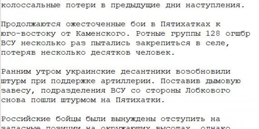 Также канал опубликовал информацию о вероятном восстановлении контроля над ранее оставленным селом Пятихатки. Днем 18 июня ряд источников сообщил, что под напором пехоты ВСУ российские войска отошли на второй рубеж обороны, после чего по украинским формированиям были нанесены массированные авиационные и артиллерийские удары.