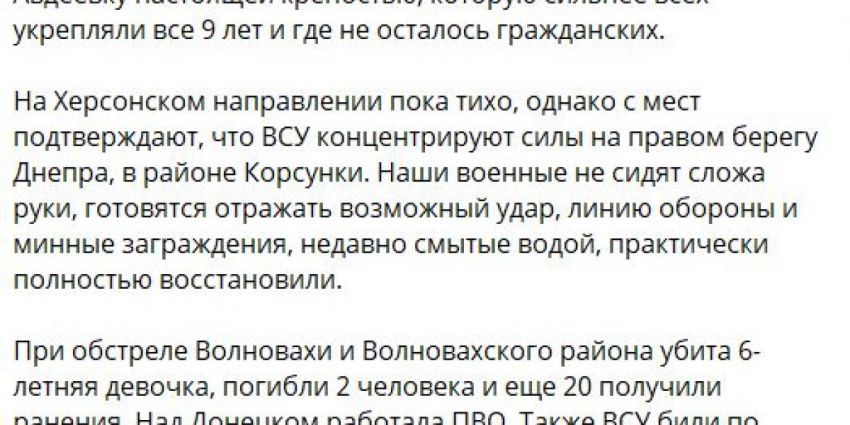В районах Петровского, Первомайского и Старомихайловки отбиты четыре атаки украинских подразделений. При этом наступающие потеряли более 340 военнослужащих, 2 броневика, 5 автомобилей, орудия Д-20 и «Мста-Б», самоходку Krab.