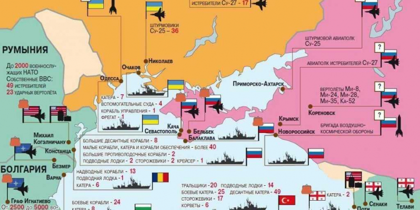 Когда-то близкие украинцы и русские, сегодня рассуждают на такие темы, о которых раньше и не думалось.Военное противостояние Украины против России нарастает. Военные аналитики Украины отлично знают соотношение сил в в армиях и флотах государств. Украина все реально оценивает и ищет союзников. Совсем недавно Запад дал правовую оценку действий Грузии в отношении Южной Осетии. Развитие подобного сценария в России не возможно. Будет получен отпор, и Украина отягощенная конфликтом с Донбассом и внутренними трудностями, может полностью развалиться. Привлечь войска третьих стран, введя их на территорию Украины, не получится. Согласно принятой доктрине Россия нанесет ответный удар по центрам принятия решений, которые будут располагаться вне территории Украины.Желающих это испытать нет. Вот по этим самым причинам Украина милитаризирует акватории Черного и Азовских морей, куда могут заходить морские военные суда других стран. Своих ВМС у Украины практически нет и по этой причине Незалежная предоставляет свои порты для базирования ВМФ НАТО.