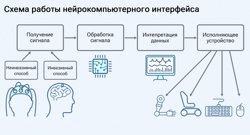 Большинство нейроинтерфейсов включают четыре этапа: сбор сигналов мозга с поверхностных электродов (в неинвазивной версии) или имплантированной микросхемы (в инвазивной версии); предварительная обработка сигналов и передача данных в компьютер; интерпретация и создание цифровых команд; управление устройством, таким как клавиатура или мышь компьютера, роботический протез, инвалидная коляска, автомобиль и т.д.
