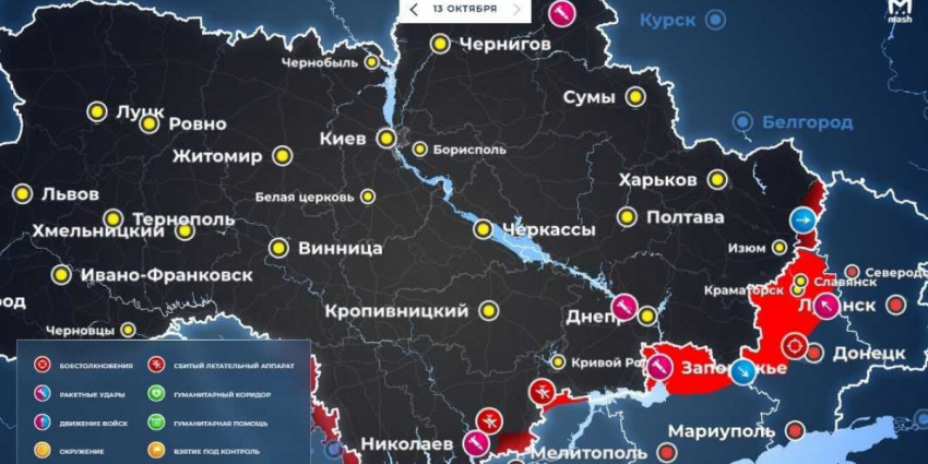 Как развивается обстановка на Украине сегодня, 14 октября 2022 года? Как выглядит последняя карта боевых действий? Что известно об обстрелах ВСУ территории РФ? Об этом далее.
