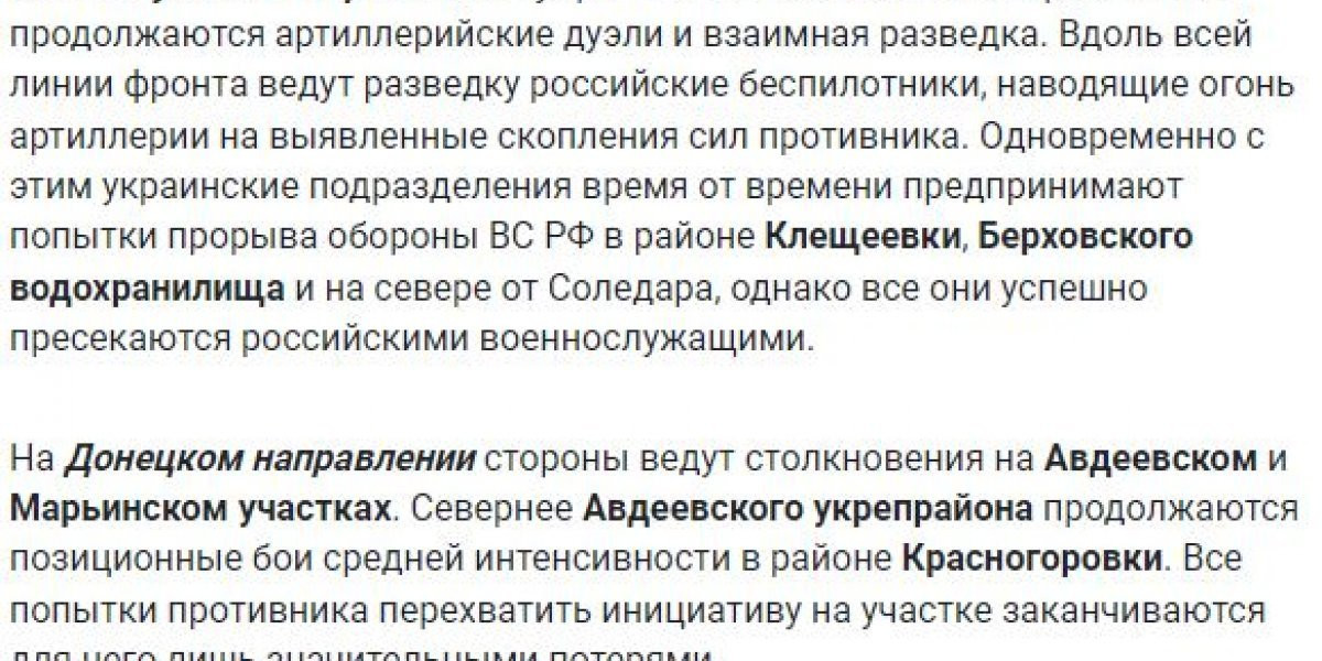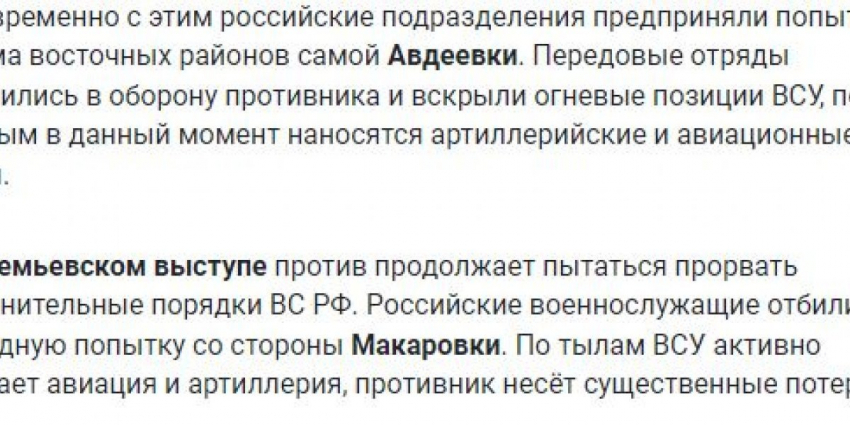 ВКС группировки “Юг” нанесли удары по опорным пунктам подразделений ВСУ в районах Белогоровки, Спорного, Богдановки и Невельского, Авдеевки, где среди прочего был уничтожены общевойсковые резервы 110-й омб ВСУ. В районе Новгородского был нанесен авиаудар по складу с боеприпасами 109-й бригады теробороны ВСУ.
