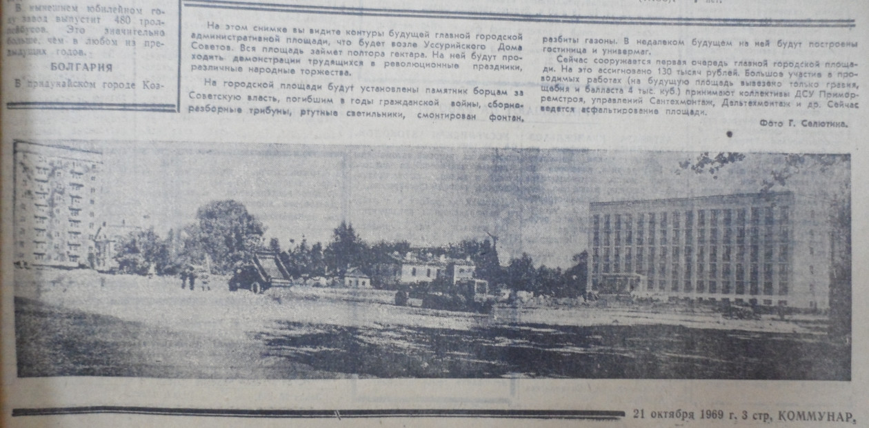Так когда же началось строительство будущей центральной площади Уссурийска? Ответ мы узнаем из газеты “Коммунар” от 21 октября 1969 года.
