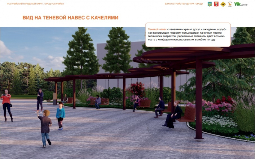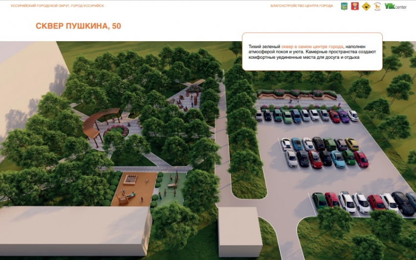 Буквально новая жизнь закипит в сквере по Пушкина, 50. В планах построить игровую и спортивную площадку, полукруглый теневой навес с качелями, установить уличную библиотеку и обустроить парковку.