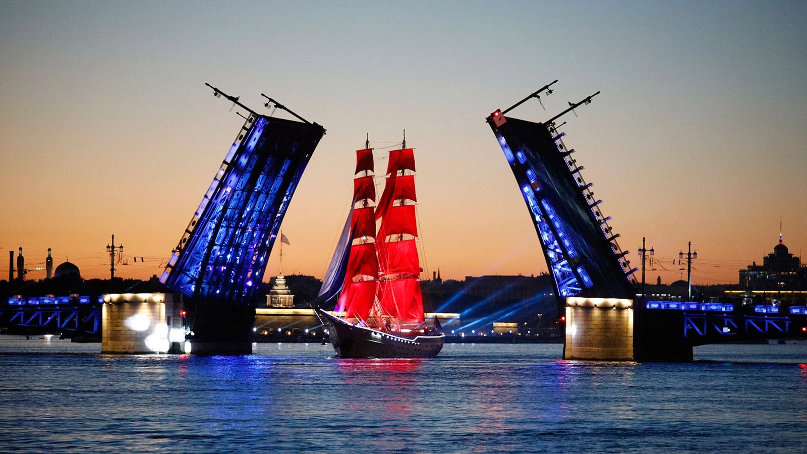 22:00 — начало концерта на Дворцовой площади. 00:40 — музыкальное световое представление на Неве и праздничный салют. 1:10 — появление судна с алыми парусами. 1:10 до 4:00 — продолжение концерта.