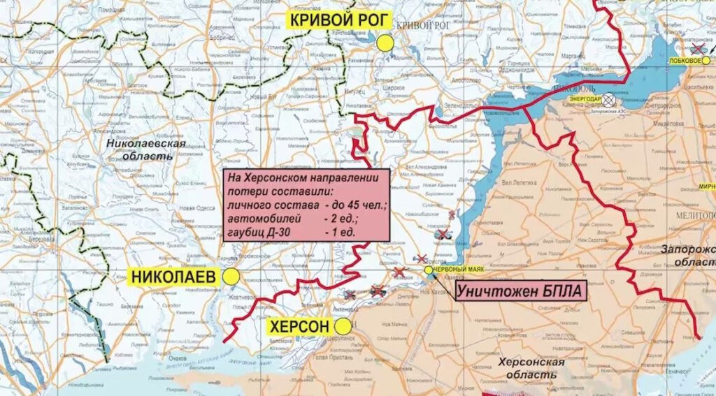 Кроме этого, в рамках контрбатарейной борьбы уничтожены две гаубицы Д-30, четыре расчета 120-мм миномета, пять боевых бронированных машин. Расчетом ПЗРК «Игла» сбит БпЛА украинских войск. Экипажами самолетов Су-34 группировки «Центр» нанесен бомбовый удар по трем опорным пунктам и пункту временной дислокации националистов в районах населенных пунктов Петровское и Терны. Об этом передает "Глас Народа".