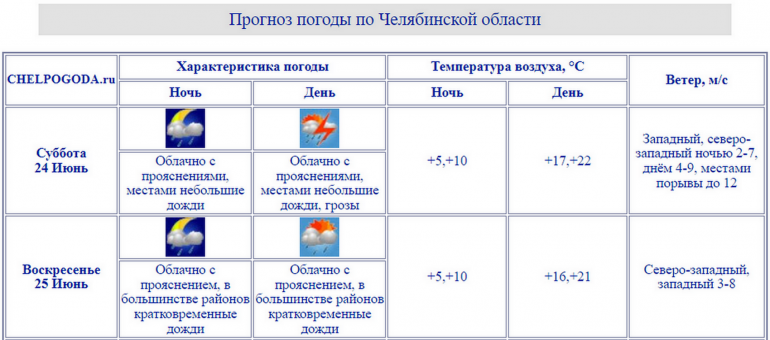 В субботу, 24 июня, в Челябинской области ожидается тёплая и облачная погода. Местами пройдут небольшие дожди и прогремят грозы. Об этом сообщили синоптики регионального Гидрометцентра.