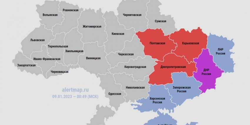 - Карта воздушных тревог Украины: 9 января 2023, данные о сирене в регионах на сегодня, тревога звучит почти в половине страны