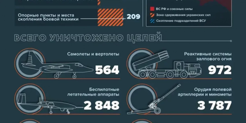 Всего с начала проведения специальной военной операции уничтожены: 365 самолетов, 199 вертолетов, 2848 беспилотных летательных аппарата, 400 зенитных ракетных комплексов, 7449 танков и других боевых бронированных машин, 972 боевые машины реактивных систем залпового огня, 3787 орудий полевой артиллерии и минометов, а также 7965 единиц специальной военной автомобильной техники.