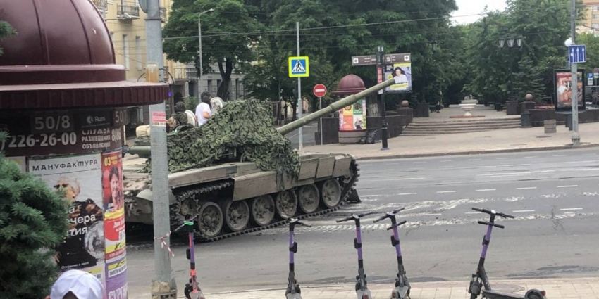 Утром 24 июня ростовские дворники приступили к уборке улиц у штаба ЮВО на фоне танков. Видео уборки опубликовал паблик «Ростов Главный».