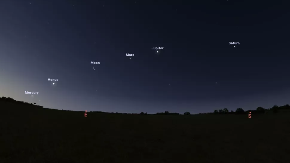 Марс (светимость 1,8) можно легко отличить по его красноватому оттенку. Планета будет находиться в ближайшем углу «планетного треугольника» к Луне. Меркурий (светимость -0,3), находящийся дальше от Луны и ближе к горизонту, будет виден в другом углу треугольника. Венера (светимость -4,6) будет расположена в центре треугольника. Легко узнаваемая благодаря своей яркости, она станет самым ярким объектом на небе после Луны.