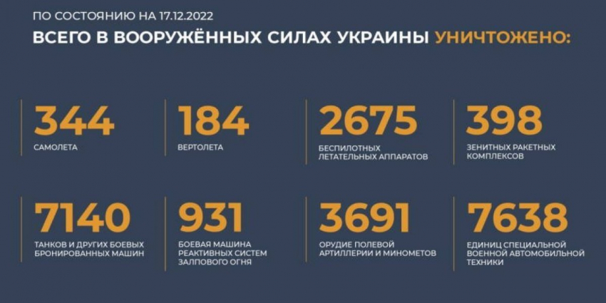17 декабря Минобороны РФ сообщило, что вооруженные силы России нанесли массированный ракетный удар по объектам Украины. В результате была сорвана переброска оружия и боеприпасов иностранного производства, а также блокировано выдвижение резервов ВСУ в районы боевых действий. В российском военном ведомстве сообщили, что удар нанесен высокоточным оружием большой дальности воздушного и морского базирования, цель удара достигнута, а все назначенные объекты поражены. Источник