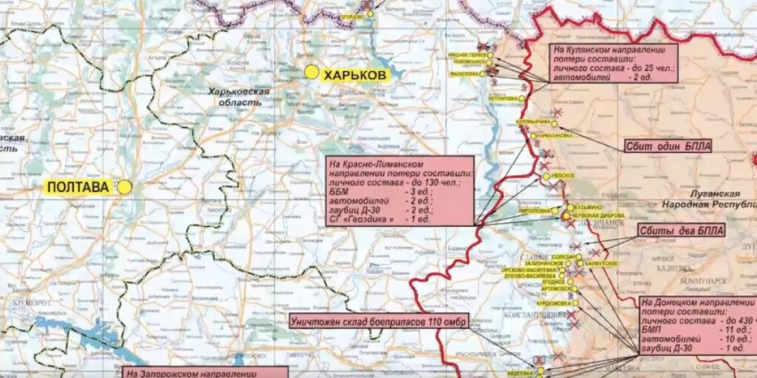 - Бахмутское (Артемовское) направление: ВСУ предпринимают попытки наступления в направлении Берховки и Ягодного. Также боевики атакуют позиции России в районе Клеещеевки;