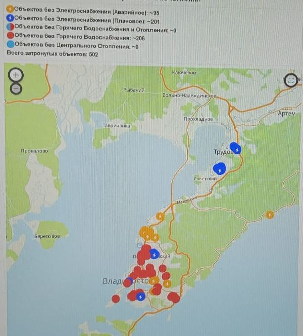 Массовые отключения электроэнергии во Владивостоке. Карта