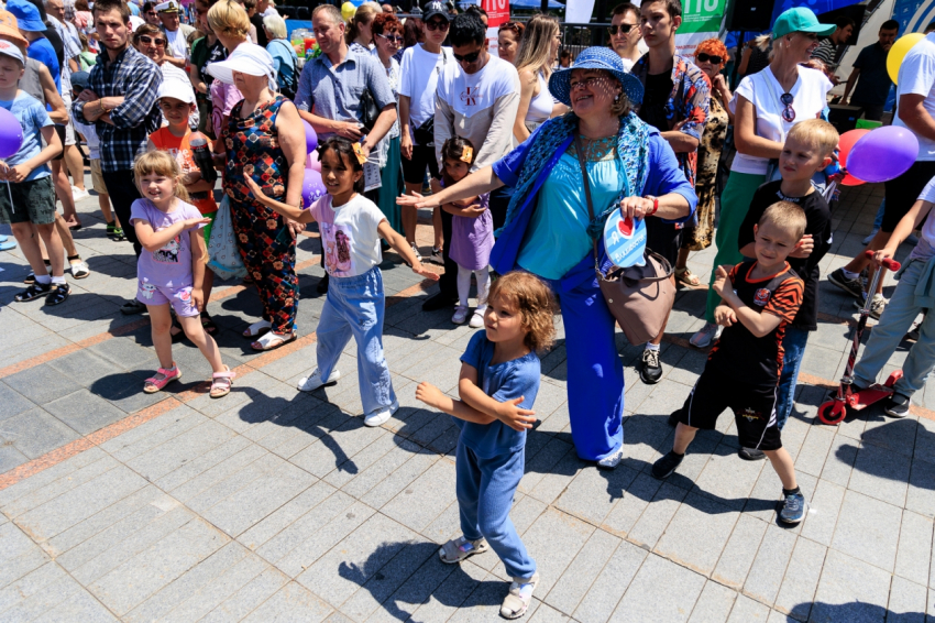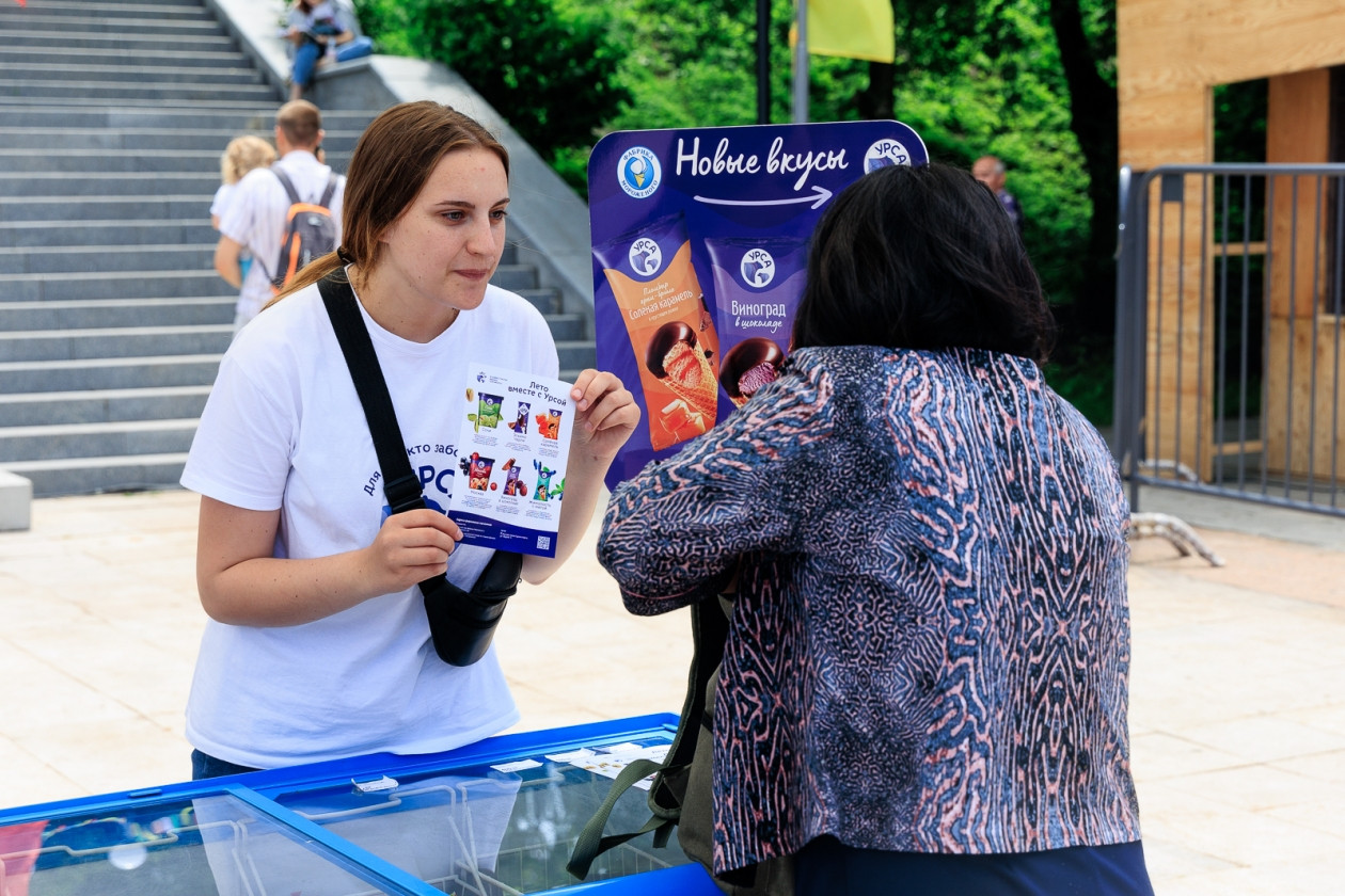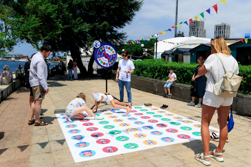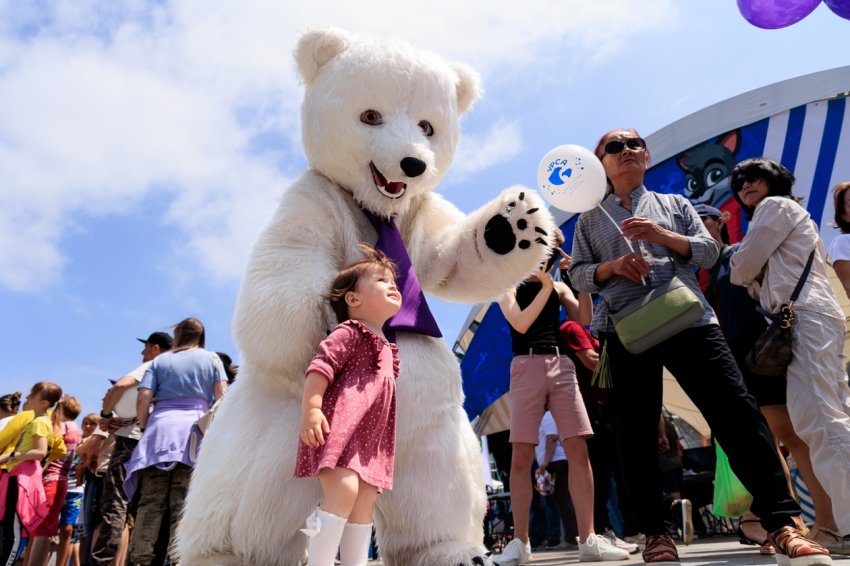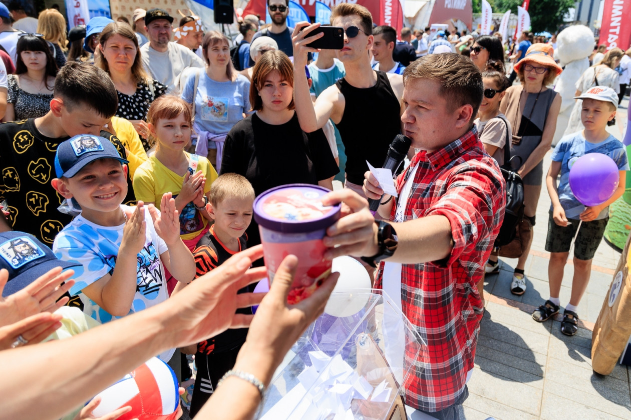 Самые маленькие горожане могли посостязаться друг с другом, поиграв в “Твистер”. Устоявшего до конца и ни разу не упавшего ждал сладкий подарок — порция любимого мороженого, а участникам раздавали яркие шарики и стикеры на телефон с изображением символа Владивостокской фабрики мороженого — медведем Урсой.