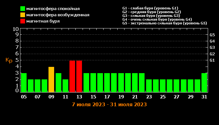 В остальные дни июля геомагнитная обстановка будет спокойной - от 2 до 3 баллов, что находится в пределах нормы.