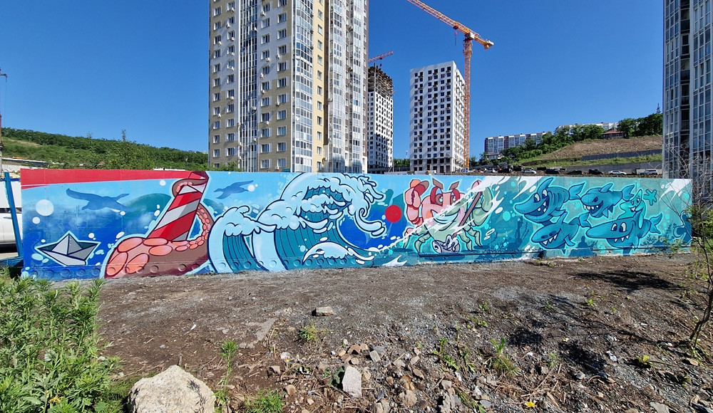 Как рассказали авторы проекта, 23 июня художники из партнерской мастерской подготовили фон и нанесли основные контуры композиции. А после совместной с местными жителями акции, 25 июня, завершили декорирование стены.