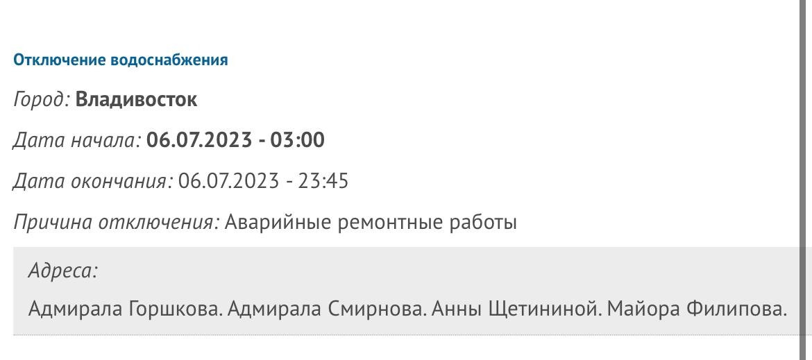 Новые отключения водоснабжения во Владивостоке. Даты и время