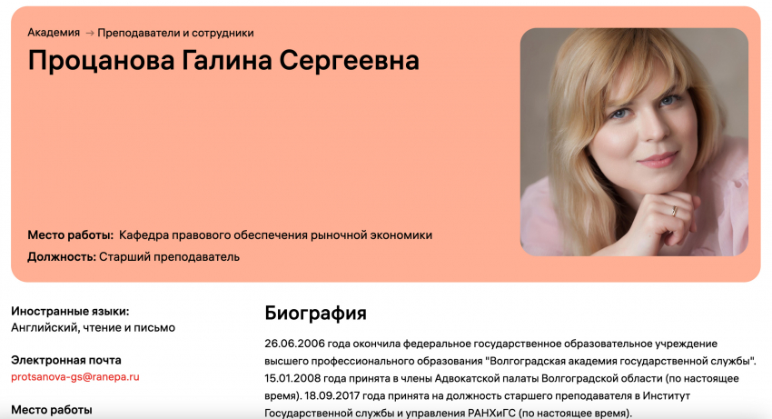 Галина Процанова родом из Волгоградской области и, похоже, познакомилась со своим будущим мужем там же, когда она была студенткой Волгоградской академии государственной службы, где Максим Назаров преподавал. В 2008 году она стала членом областной адвокатской палаты и после переезда в Москву вместе с Назаровым стала старшим преподавателем в РАНХиГС, где по сей день работает и получает заработную плату.