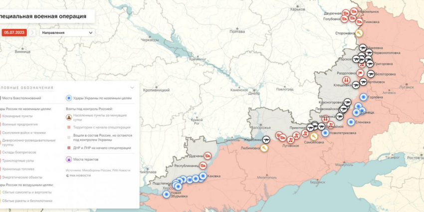 - Карта боевых действий на Украине, к утру 6 июля 2023г., от РИА Новости. Карта специальной военной операции.
