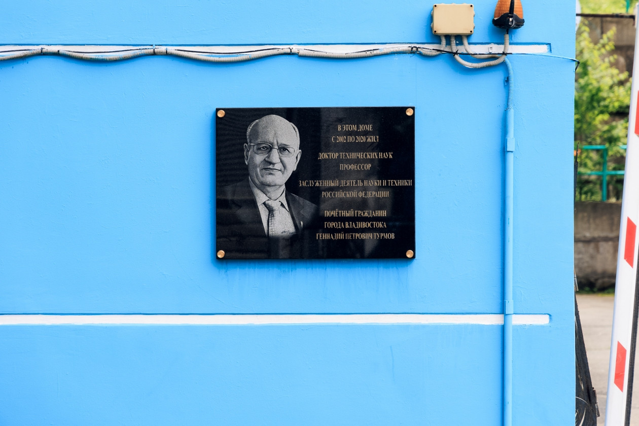 Торжественное открытие мемориальной доски заслуженному деятелю науки и техники Российской Федерации, почетному гражданину Владивостока Геннадию Турмову состоялось в пятницу, 7 июля, в приморской столице. В мероприятии приняли участие представители общественности и заместитель главы администрации Владивостока Николай Селюк, сообщает ИА PrimaMedia.