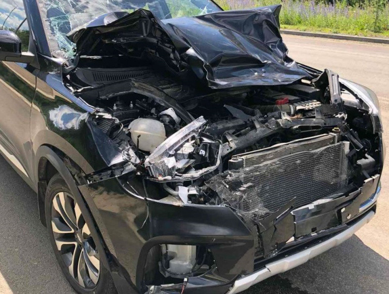 Лось уже выскочил из леса, он уже бежит к точке пересечения его траектории движения и траектории движения автомобиля, а водитель продолжает спокойно ехать с большой скоростью. Лось неожиданно появляется перед автомобилем, а время на торможение у водителя уже нет. Приехали.