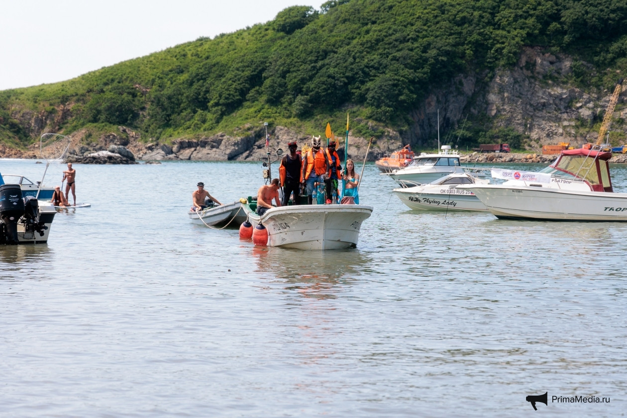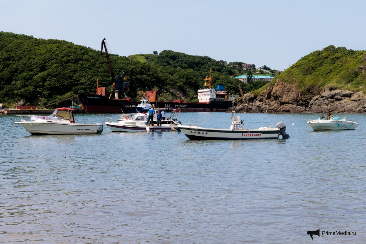 Ранним утром 9 июля участники соревнований по спортивной рыбалке “Открытое море” на катерах вышли из Владивостока и Большого Камня в акваторию Уссурийского залива, чтобы наловить как можно больше рыбы и в середине дня прийти в бухту Подъяпольского на контрольное взвешивание и подведение итогов.