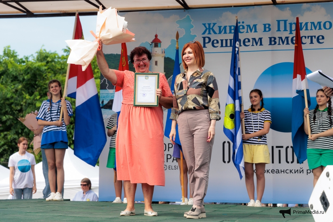 В 16.00 стартовала официальная часть, предвещавшая раскрытие главной интриги дня — награждение победителей “Открытого моря”. Поздравить гостей праздника с Днем рыбака от лица губернатора Олега Кожемяко и себя лично приехала заместитель председателя правительства Приморского края — министр культуры и архивного дела Приморья Елена Бронникова. Также в честь открытия “Выставки достижений народного хозяйства” (0+) она вручила приветственный адрес от губернатора Олега Кожемяко главе Шкотовского муниципального района Владимиру Носову.