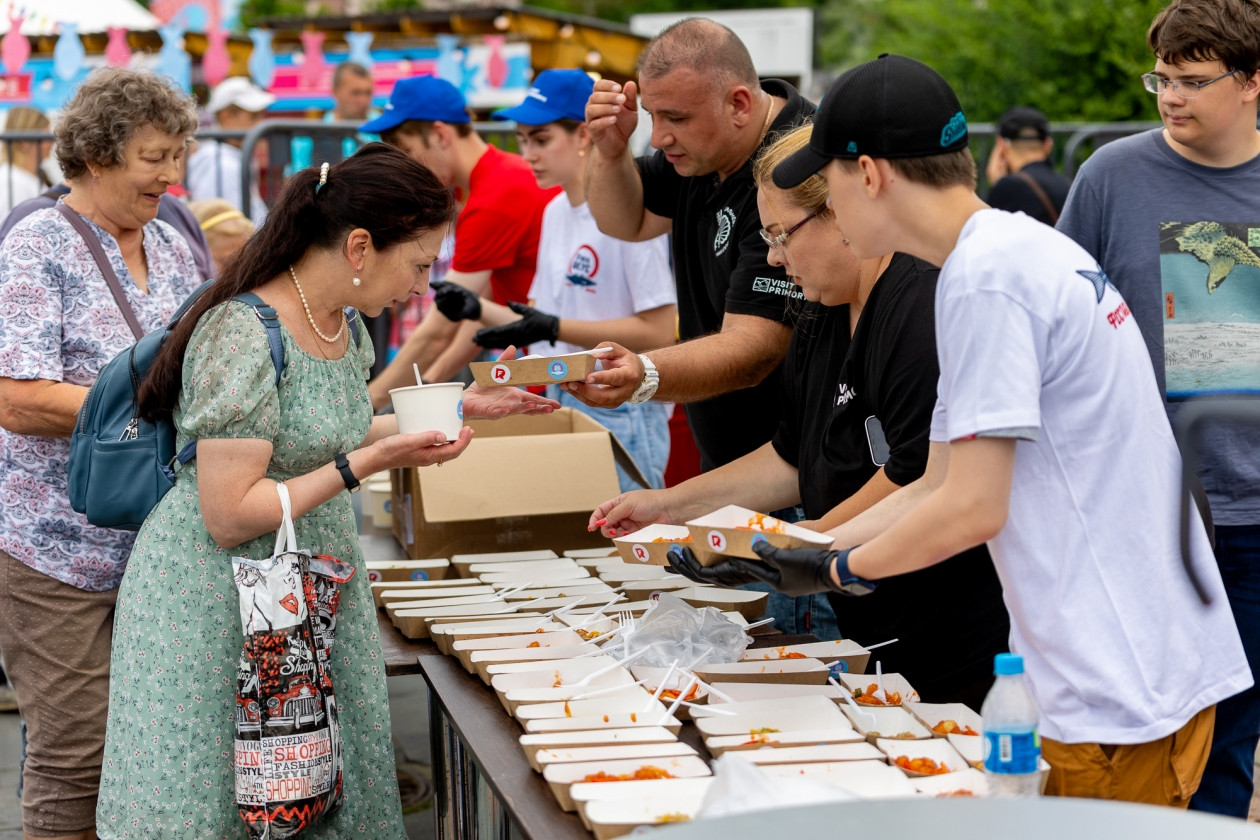 От первых ярких впечатлений и свежего морского воздуха у многих разыгрался зверский аппетит. Заморить червячка помог уже ставший традиционным ДоброСуп от компании “Доброфлот”. Готовили уху в огромных котлах и сноровисто разливали ее по картонным стаканам. Подавали ДоброСуп вместе со свежим хлебушком. Совершенно бесплатно. Запланированная 1 тысяча порций быстро закончились. Однако в компании предусмотрели такой вариант. Скрести по сусекам не пришлось — доппаек был заготовлен с лихвой и доставлен заранее. Повара вновь расчехлили ножи и принялись за дело.
