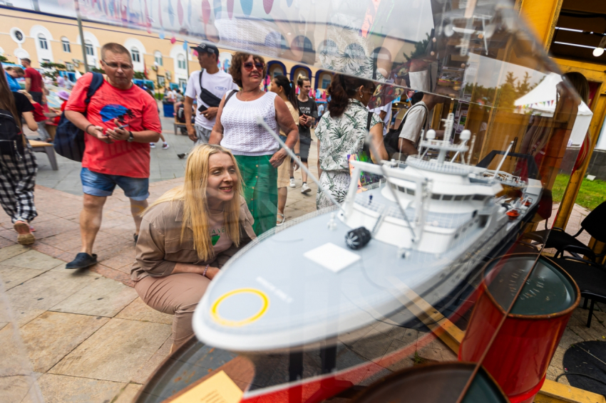 Довольно яркой и красочной была детская зона. Здесь проводили мастер-классы по росписи ракушек, тельняшек, камней, деревянных магнитов гуашью или акварелью; по технике макраме “Брелоки Рыбка и Листики”; по живописи “Рисуем море”; по оригами “Бумажный кораблик”. Детям и взрослым предлагали поучаствовать в викторине. Гостей ожидал сладкий приз или карточки с надписями, например, “Любитель кофеина” или “Фотографирую во сне и наяву”. На площадке устроили “артхаус” из мелков и красок. Дети могли рисовать на макетах кораблей или мольбертах. Кто-то предпочел прямо на тротуаре. И ведь получилось! В “Чудоострове” были представлены книги на тему истории края, рыболовства, морских путешествий и т. д. Издания были и научные, и художественные.