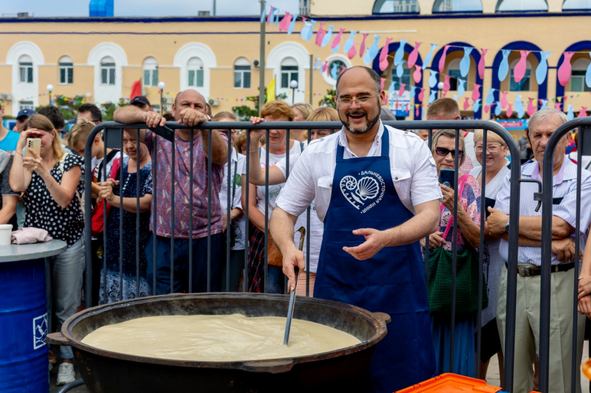 В 11.00 свои “точки” развернули такие известные в городе заведения, как “Ракушка”, “Пекарня”, “Огонёк”, “Сестры Ким”, “Токио”, “Баба Тома”, “Пянсе”. Мысленно представили на одном столе тарелки с картофелем фри с ламинарией, с устрицами с изюмом или джемом, с солянкой с кальмаром, с окрошкой на тане, с минтаем фри. И наконец — с дальневосточным пловом с морепродуктами, приготовленном в большом казане! Получилось феерично.