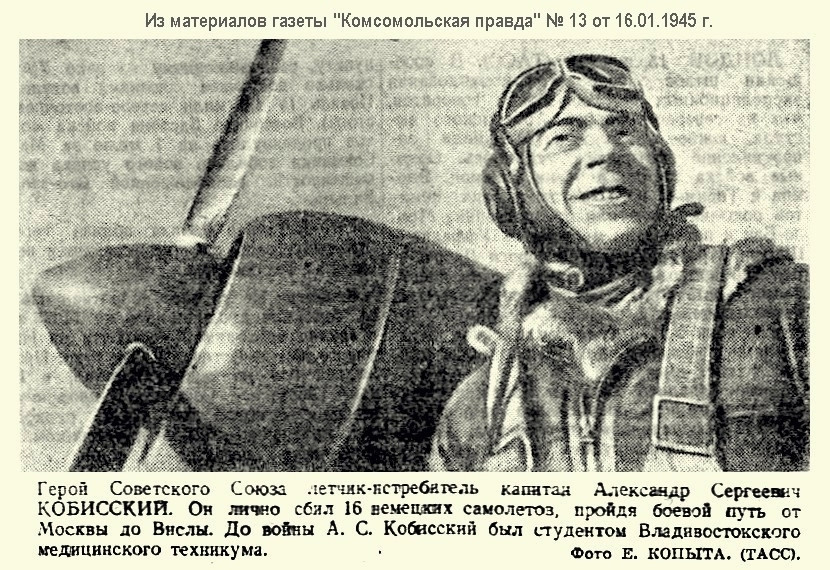 Еще один известный летчик — Герой Советского Союза Александр Сергеевич Кобисский — родился 15 июля 1920 года в селе Михайловка в Приморье. В годы Великой Отечественной войны наш земляк совершил 343 боевых вылета и лично сбил 17 самолетов противника. Погиб при исполнении служебных обязанностей 15 марта 1950 года. Похоронен в родном селе, именем Кобисского названа улица в Михайловке.