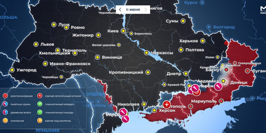 Карта, новая карта боевых действий в реальном времени от mash (данные на 13 июня 2023).