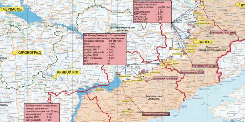 Помимо этого в селах Красногоровки и Богдановки в Донецкой народной р*еспублики (ДНР) российские войска уничтожили военных и технику украинской стороны, ликвидированы 2 склада боеприпасов 35-й бригады морской пехоты и 79-й десантно-штурмовой бригады Украины в районе Разлива и Парасковиевки в ДНР.