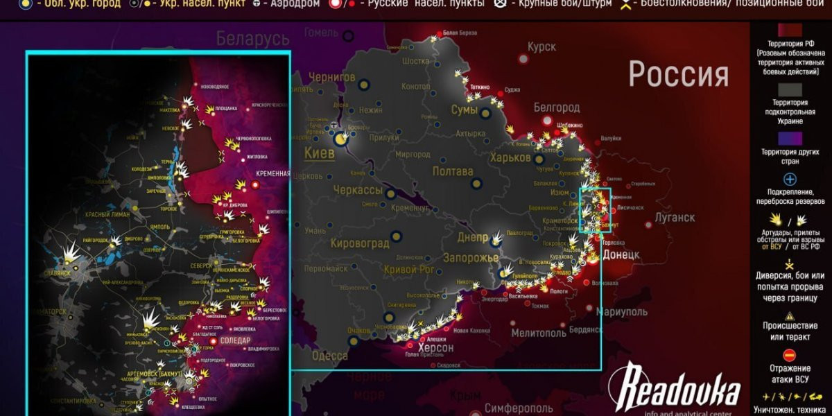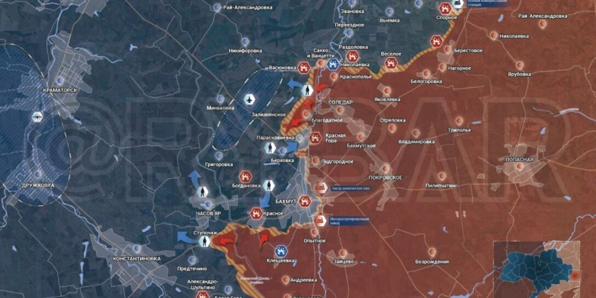 Основная задача русской армии в Артемовске (украинское название — Бахмут) — дать возможность войскам продвинуться. Об этом в интервью военкому Семену Пегову заявил бизнесмен Евгений Пригожин. Он назвал город «главной достопримечательностью» украинских военных. Карта