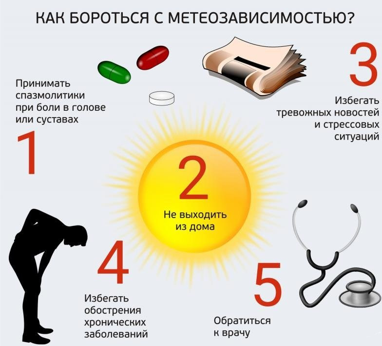 Специалист советует метеозависим людям, которые отмечают у себя головную боль, перепады настроения, вспышки агрессии, пройти обследование. Врач поможет подобрать терапию и скорее всего, метеозависимость уйдет.