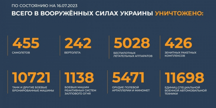 Потери Украины на сегодня 14.07.2023 Всего с начала проведения специальной военной операции уничтожено: 455 самолетов, 242 вертолета, 5009 беспилотных летательных аппаратов, 426 зенитных ракетных комплексов, 10700 танков и других боевых бронированных машин, 1138 боевых машин реактивных систем залпового огня, 5453 орудия полевой артиллерии и минометов, а также 11664 единицы специальной военной автомобильной техники