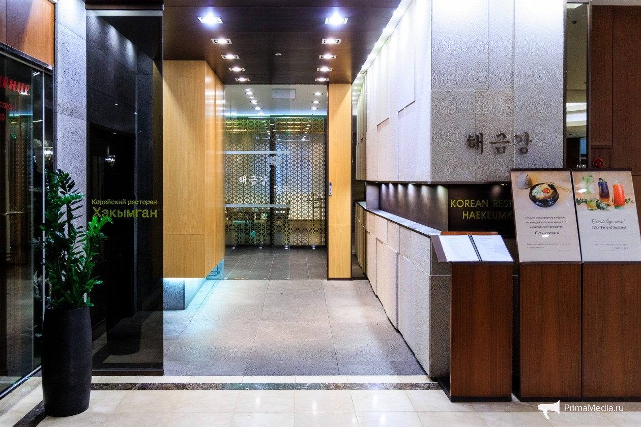Для гостей работает корейский ресторан “Хэкымган”, в меню которого объединены традиционные и современные рецепты Южной Кореи. Предложение постоянно обновляется. Например, сейчас в ресторане можно попробовать “суп для жарких дней” с цыплёнком и женьшенем — “Самгетан”. Среди специальных предложений от корейского бренд-шефа также — холодная лапша с соевым молочком “Кон куксу”. Ещё одна новинка меню — “Кимчи из дикого лука”. Предметы интерьера ресторана выполнены из натуральных материалов в корейских традициях. Приятную атмосферу создаёт расслабляющая музыка.