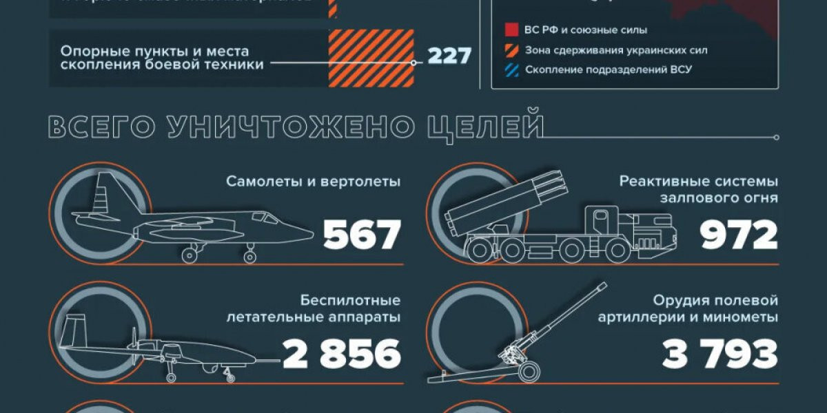 Истребительной авиацией в ДНР сбиты самолеты Су-25 и МиГ-29, а также вертолет Ми-8 Воздушных сил Украины. Средствами противовоздушной обороны уничтожены 8 украинских беспилотных летательных аппаратов в ЛНР и Харьковской области, перехвачены 10 снарядов систем залпового огня (РСЗО) HIMARS и «Ураган» в ДНР и Запорожской области.